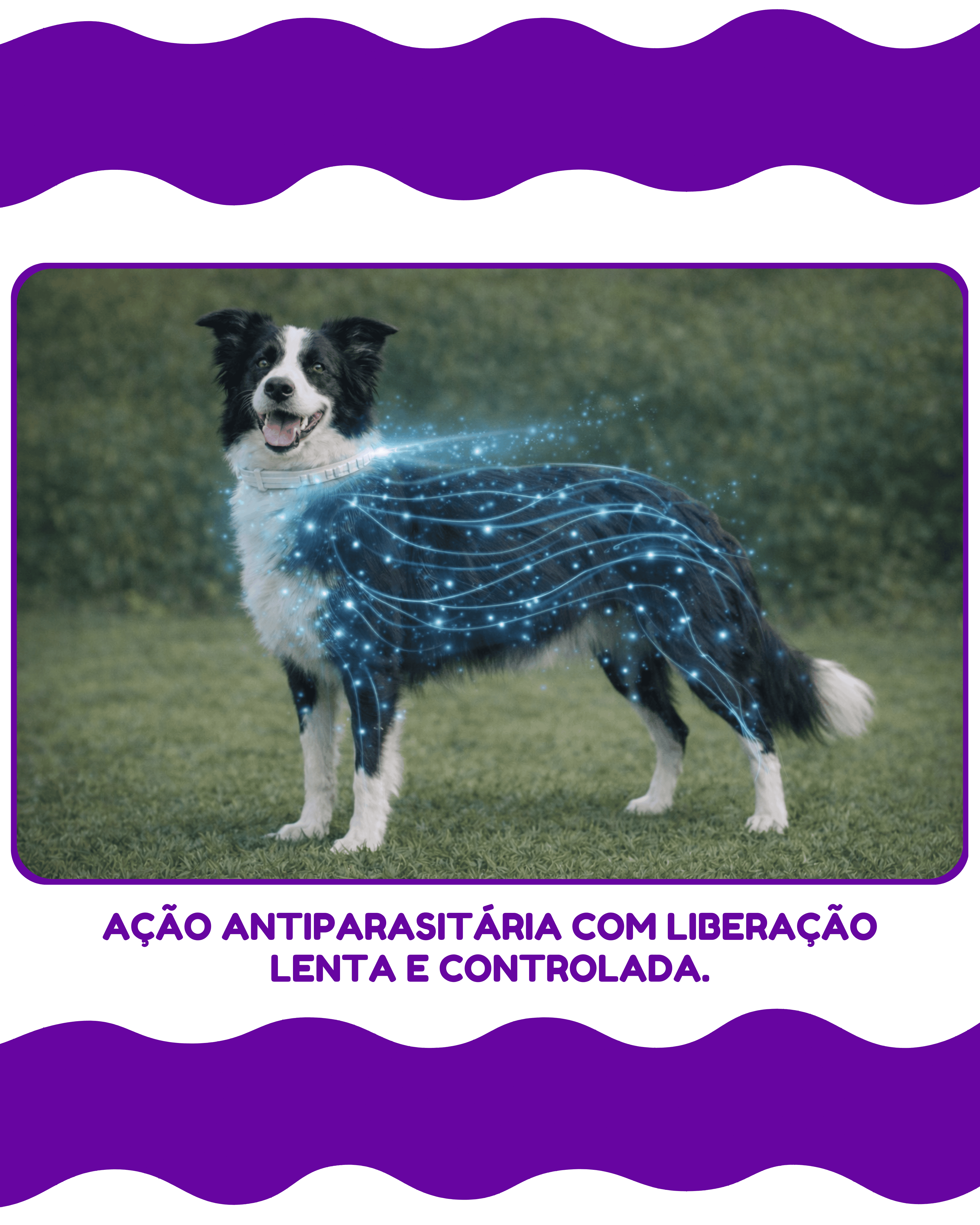 A coleira possui ação prolongada com liberação lenta e contínua dos ativos, podendo auxiliar na proteção por até vários meses, desde que utilizada corretamente.
