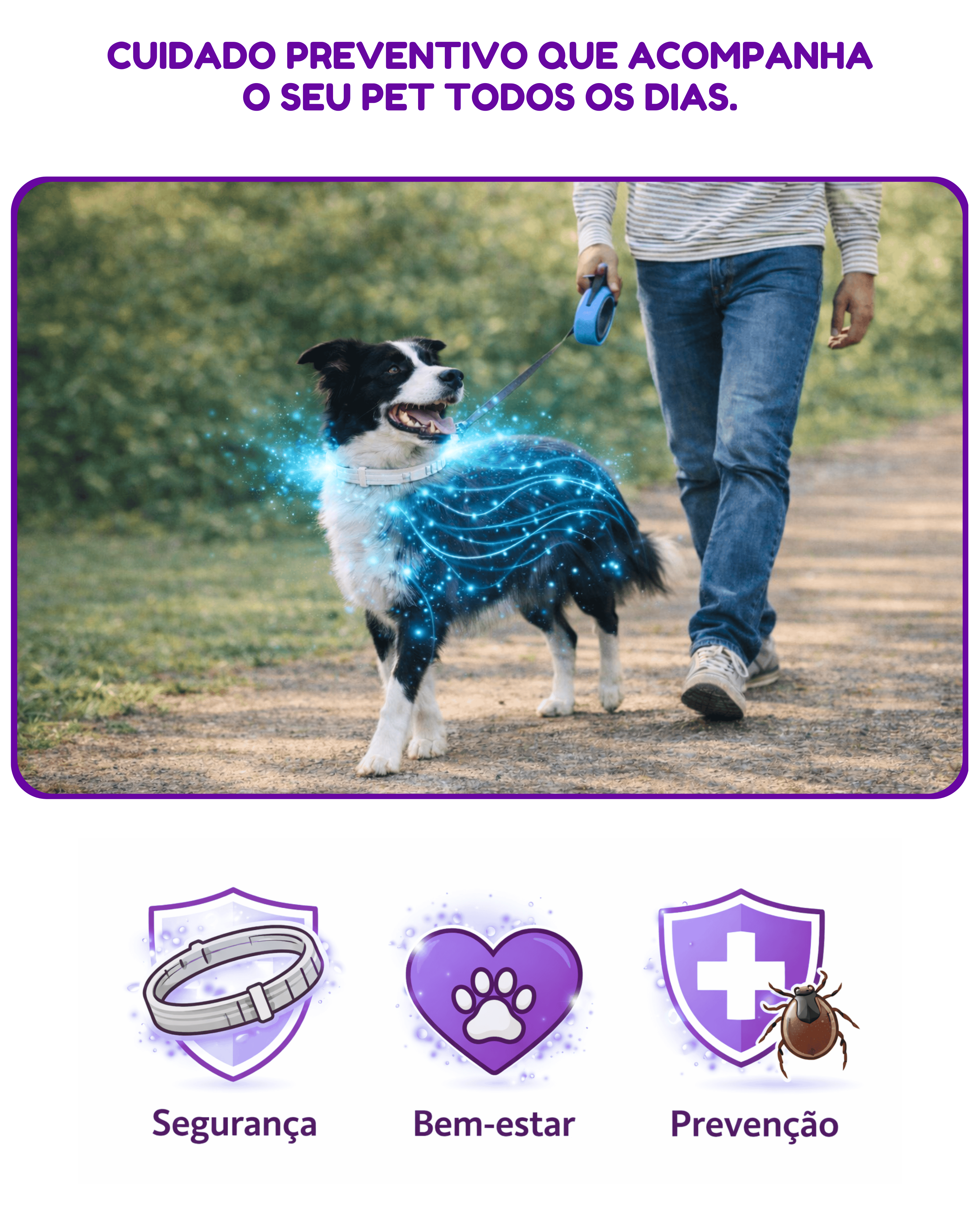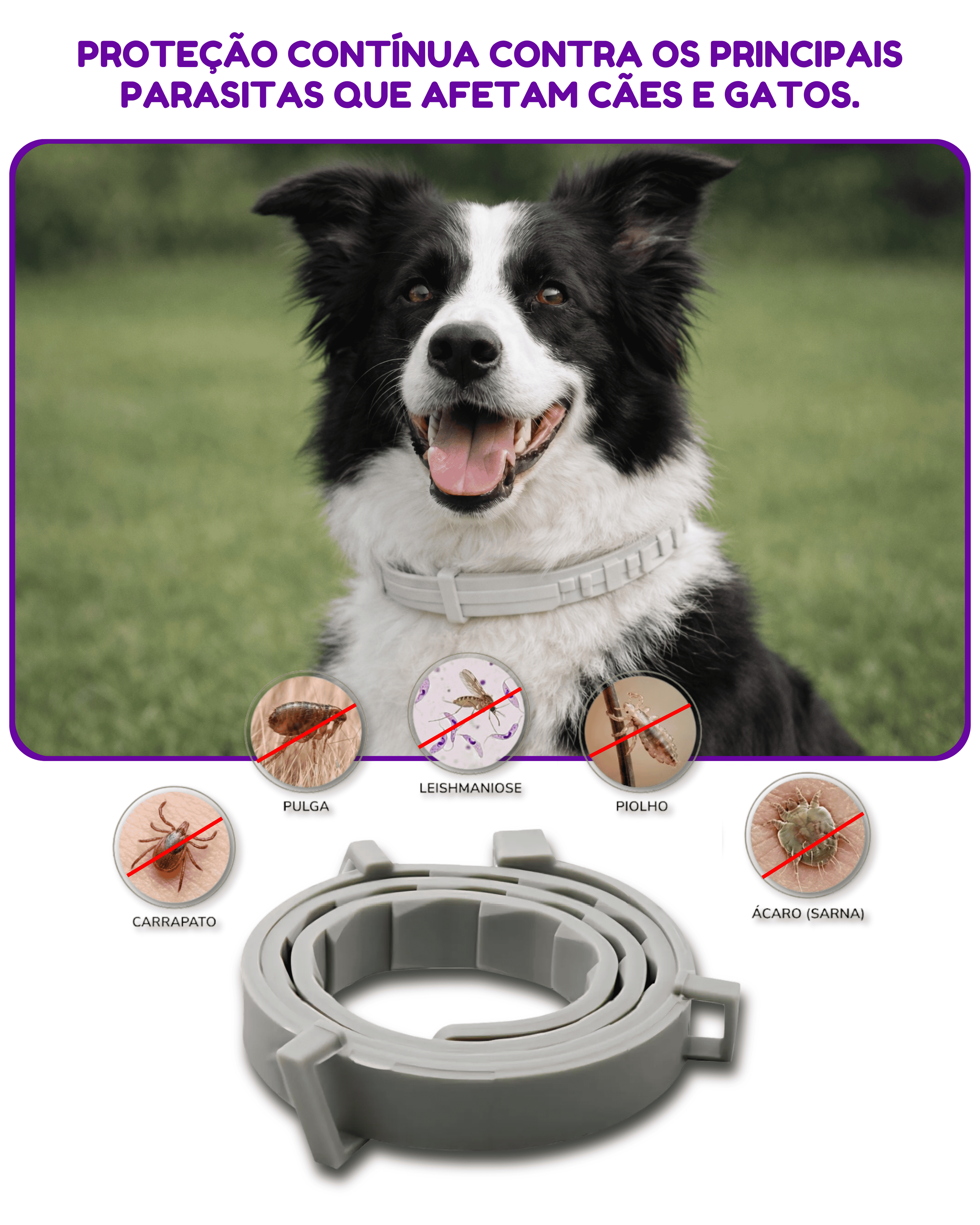A coleira antiparasitária foi desenvolvida para auxiliar na repulsão desses parasitas, atuando de forma contínua e prática no dia a dia do animal, inclusive contra insetos vetores associados à leishmaniose.Uma solução pensada para quem busca prevenção diária e cuidado responsável.